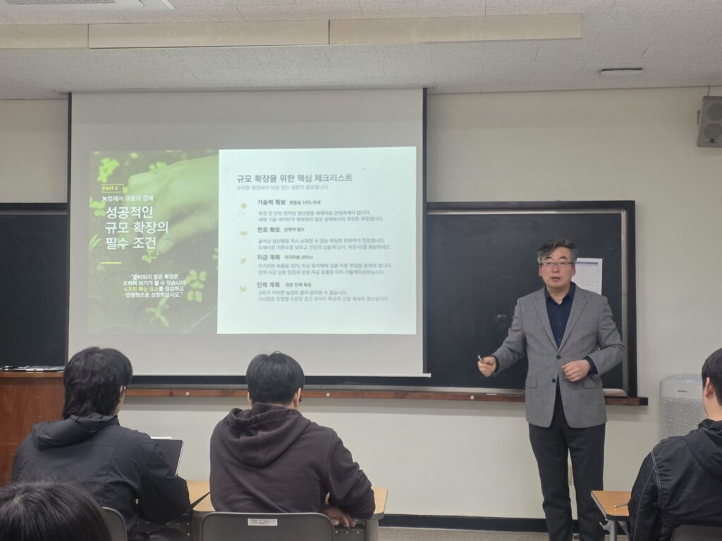 강석균 행정사는 정책자금, 청년창업농, 후계농업경영인, 스마트팜 창업, 후계농 산업기능요원, 스마트팜 혁신벨리 등을 주제로 대학 현장 특강을 진행해왔습니다. 실제 사례와 제도 이해를 바탕으로, 준비 방향과 사업계획의 핵심을 쉽게 전달하는 강의를 이어가고 있습니다.